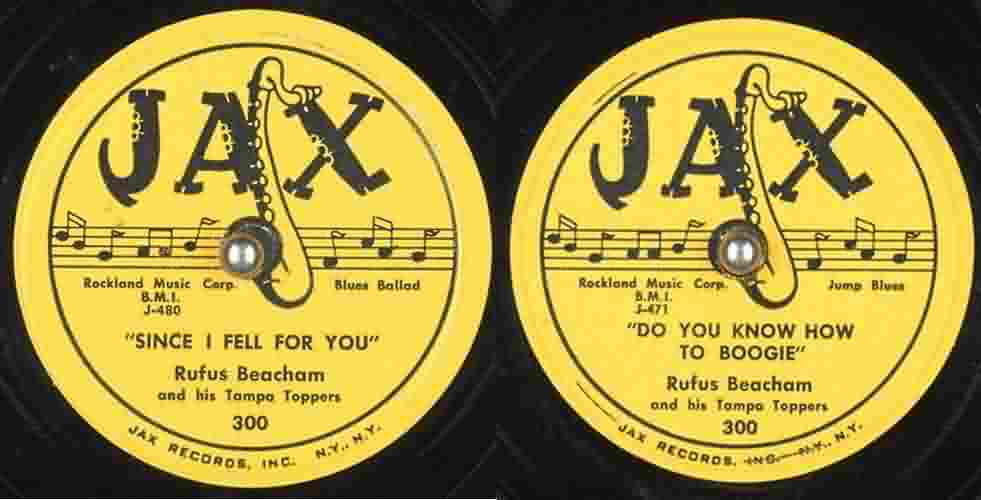 Rufus' "Since I Fell For You", backed with "Do You Know How To Boogie" were released in early July 1952. Credited to "Rufus Beacham & His Tampa Toppers", they were on the Shads' new Jax label. (Jax was a subsidiary of Sittin' In With, and not a Mercury company, since Mercury never finalized the deal to purchase SIW.) Nothing ever gave any personnel for this group, but both sides have a prominent sax.