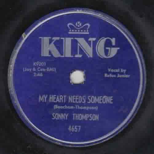 The next King release, in September 1953, was "My Heart Needs Someone", which was copyrighted on September 23 by Rufus and Sonny. It was given a 79 in the October 10 Billboard: "A pleasant relaxed side this, by Sonny Thompson. Rufus Junior does a vocal with a good measure of individuality".