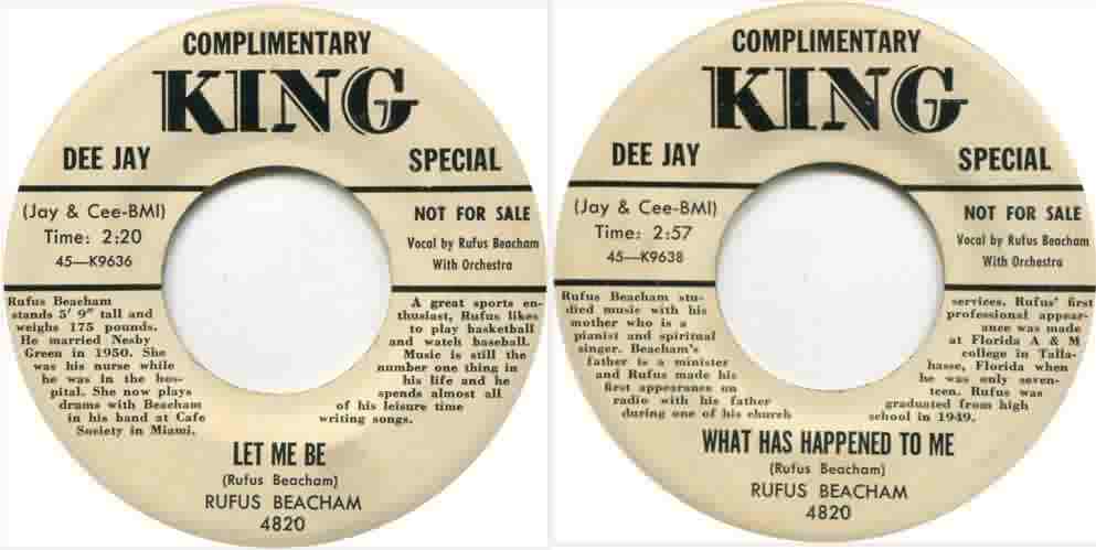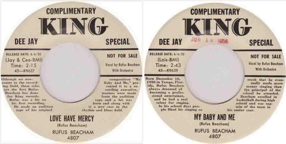 On May 11, 1955 Rufus recorded some more songs for King: :"Love Have Mercy" (the same song as "Lord Have Mercy" on Rufus Beacham Records), "My Baby And Me" (a reprise of the first song he'd ever released), "Let Me Be", and "What Has Happened To Me" (all four of which were copyrighted on May 24). Only his name appears on labels, and all feature his bluesy piano playing. Again, I have to ask if these were done in Cincinnati, since he was performing (and living) in the Miami area. Cincinnati wasn't really an R&B hotspot and King tended to schedule sessions when the artist was playing relatively near the city (the same way they brought in bands to back up those singers). Rufus wasn't playing any closer than 1000 miles from Cincinnati. Note that King demo labels featured "bios" of the artists; don't take them too seriously.