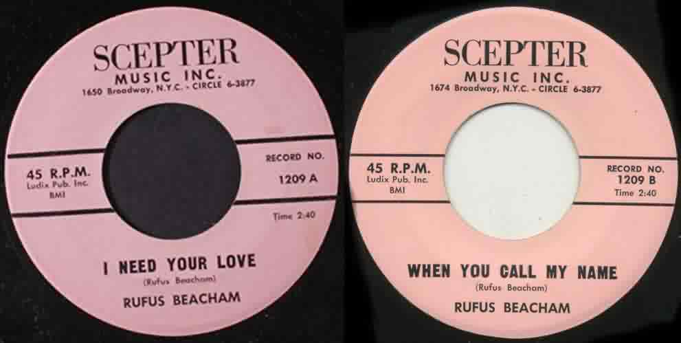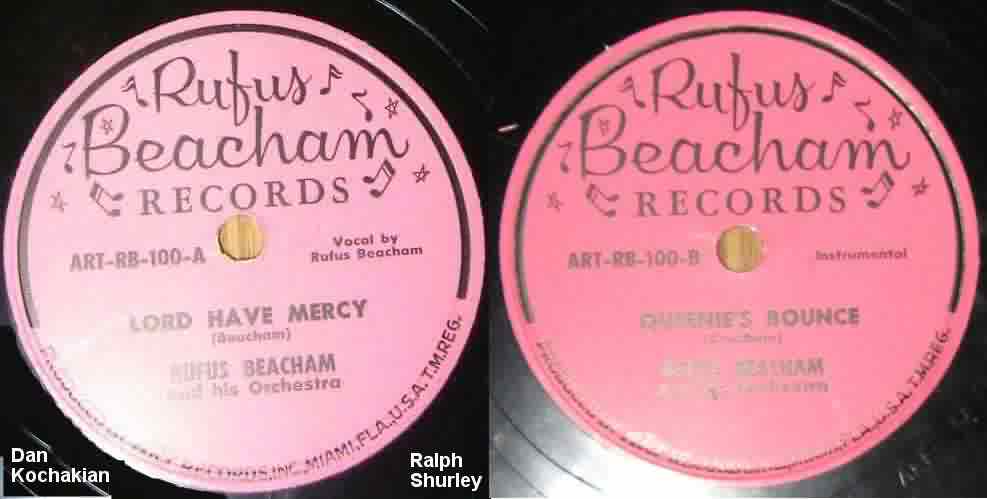 There's a record on the "Rufus Beacham Records" label, probably from 1954: "Lord Have Mercy", coupled with the instrumental "Queenie's Bounce", by Rufus Beacham and His Orchestra. This is, presumably, something he had pressed up to sell at shows.