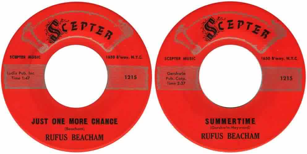 Rufus' last Scepter record, issued in January 1961, was "Summertime". He was trying for a Soul arrangement, but to me, it doesn't work. The flip, "One More Chance", is simply nothing special.