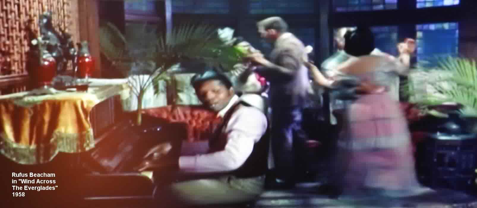 Quick! Can you name a movie that has Burl Ives, Christopher Plummer, stripper Gypsy Rose Lee, boxer "Two-Ton" Tony Galento, Peter Falk (in his first film), novelist MacKinlay Kantor, jockey Sammy Renick, and Ringling Bros. clown Emmett Kelly? No, I haven't lost my mind (at least, not completely). The movie is 1958's "Wind Across The Everglades". It was filmed in Everglades City, Florida and also contains the only filmed performance of Rufus Beacham as (... wait for it ...) the pianist. I tried (valiantly, I might add) to watch this slightly-less-than-Oscar-winning film, but in the end all I could do was snap a photo of Rufus' 5-second screen appearance.