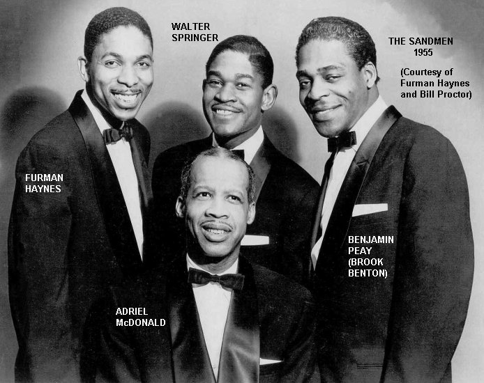 Since Okeh wasn't pushing the Sandmen's records; and since, without telling the group, "Brook Benton" was plastered all over their latest release (on which they were only on one side anyway); and since their Columbia contract wasn't picked up when it expired on June 13, Adriel McDonald, Walter Springer, and Furman Haynes went their separate ways. (In the 60s and 70s, Adriel McDonald would appear in many Ink Spots groups, some of which would also have Walter Springer.)
