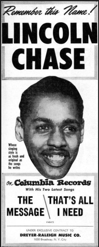 By that time, the Sandmen had been back to the studio. On February 4, 1955 they'd been brought in to provide backup for songwriter/singer Lincoln Chase [future writer of "Jim Dandy"] on "That's All I Need", "I'm Sure", "The Message", and "Things Money Can't Buy". "That's All I Need" and "The Message" were released on the prestigious Columbia label in April.