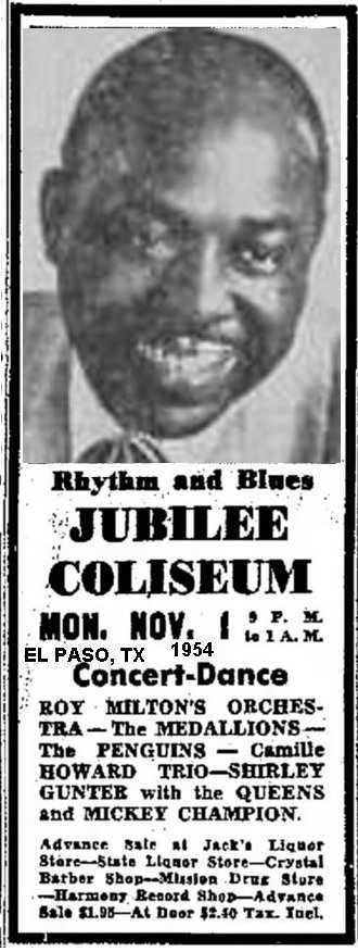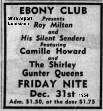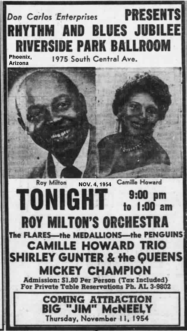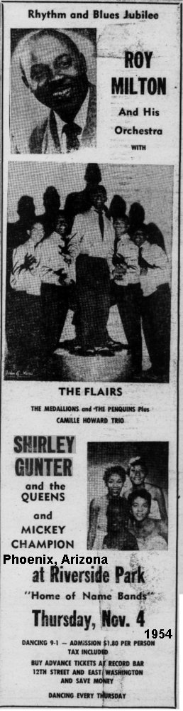 In November 1954, the Queens went on tour with Roy Milton. Known appearances were at the Coliseum in El Paso (November 1), the University Of Arizona Auditorium (November 3), and Riverside Park in Phoenix (November 4). Others in the package included the Camille Howard Trio, the Flairs, the Medallions, the Penguins, and Mickey Champion. [Note that one of the Riverside ads included a photo of the Flairs I've never seen before. Unfortunately, it's not great quality.] The November 27 Cash Box said: "Roy Milton along with Shirley Gunter and The Queens left on a cross-country tour to the East Coast. Milton will be in Oklahoma to present his annual Roy Milton Thanksgiving Day award to the winning football team. Presentation will be made at a dance following Thanksgiving game between Tulsa and Muskogee." By the time they played the Ebony Club in Shreveport, Louisiana on December 31, all had departed except Milton, the Queens, and Camille Howard (and possibly Mickey Champion). Milton was at the Manhattan Casino, in Tampa, on January 29, 1955, but the Queens weren't part of the advertisement.