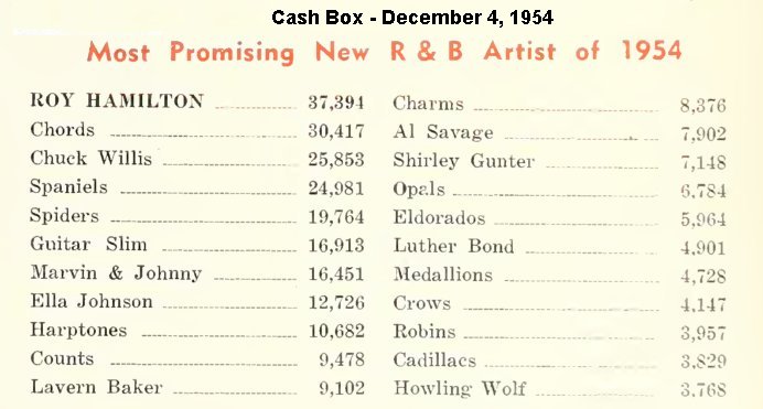 It must have been somewhat galling for the members of the Queens, since the Cash Box poll for the Most Promising New R&B Artist Of 1954 had Shirley's name, but not the group's. She came in 14th, way behind leader Roy Hamilton. Still, just being on the list meant something.