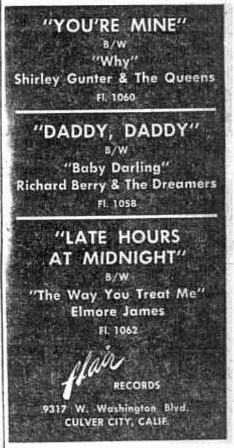 The May 11 Cash Box announced that Buck Ram and Joe Delaney had formed Delaney-Ram Associates, a personal management company with offices in New York and Hollywood. It named the acts that they managed and, strangely, the Flairs weren't on the list.