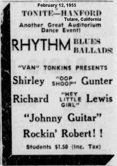 On February 12, Shirley was at the Hanford Theater in Tulare, California, along with Richard Lewis and "Johnny Guitar" (presumably Johnny "Guitar" Watson). The Queens weren't mentioned in the ad.