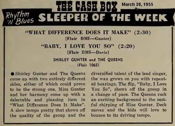 March saw the next Queens record: "Baby, I Love You So", backed with "What Difference Does It Make". They were reviewed in the March 26, 1955 trades. Here's what Billboard had to say: Baby, I Love You So (73): "Bright rhythm ditty is swung infectiously by thrush and vocal combo. Could pull juke coin." What Difference Does It Make (69) "Lazy beat ballad is presented pleasantly. It's a Shirley Gunter original [that is, Shirley wrote it]." Once again, however, only Shirley was mentioned in the review, not the Queens. But they were named in Cash Box, where it was the Sleeper Of The Week on March 26.