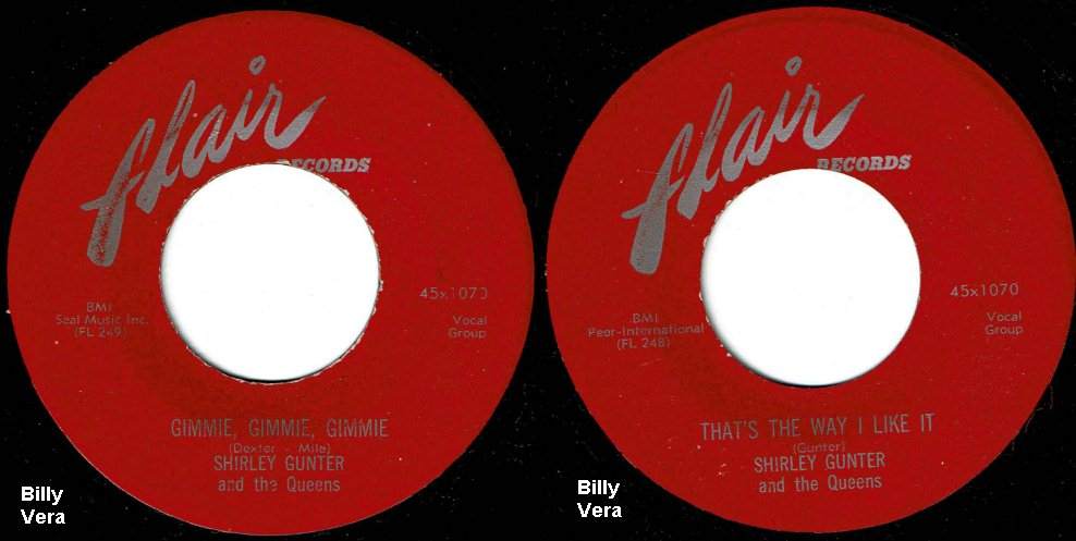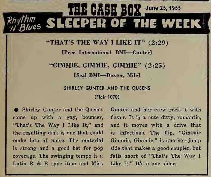 In June, Flair released the final Queens record, "That's The Way I Like It", coupled with "Gimmie, Gimmie, Gimmie". The June 18 Billboard gave the top side a 73: "The fem group wails on a Latin-flavored rhythm tune for a forceful, pop-styled endeavor." Although the "fem group" wasn't identified at that point (the review was just headed "Shirley Gunter"), it was on "Gimmie, Gimmie, Gimmie", which got a 72: "Shirley Gunter and the Queens deliver a spirited shout with a strong beat."