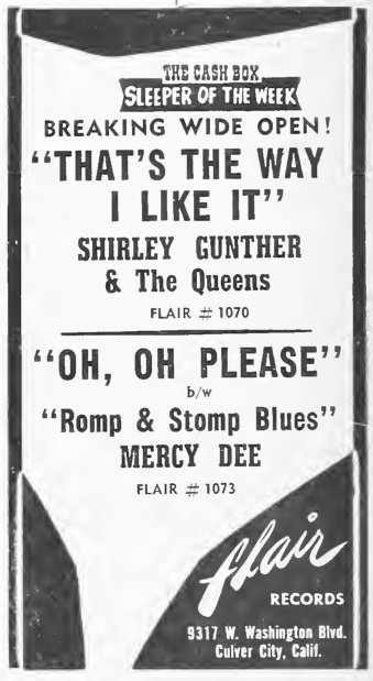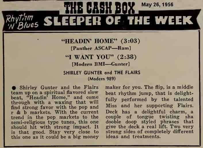 SHIRLEY GUNTER & THE FLAIRS are creating a sensation with every appearance these days, since Shirley is combining her talents with her brother, Cornelius' group, already well known as THE FLAIRS. Both were outstanding groups before, but just wait till you see or hear them now! I just heard the tape on their first session under the new arrangement, and it's a two sided hit or I'll eat my hat! They say everybody wants to get into the act, and Shirley's mother is no exception, Must be where the kids get their talent, cause she wrote the rhythm tune and it's even peppyer [sic] than Shirley's "Oop Shoop" which gave her the big name. Get this crazy title - "IPPSY OPSY OO" [sic]!!!!! And the ballad side - a really lovely song called "HOW CAN I TELL YOU" which Shirley sings with such great warmth and feeling, it should put her right up with the top pop artists. Meanwhile, her "THAT'S THE WAY I LIKE IT" is going great guns - - so just be ready for lots of action from these youngsters. Guess you know Shirley was named 3rd Most Up & Coming Female Vocalist in June 18th Cash Box, of which we are all proud. [Shirley was right behind Etta James and Dakota Staton.]
