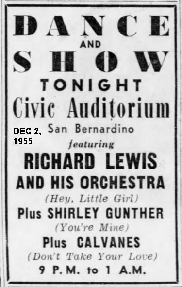 On October 7, Shirley, the Platters, and the Chuck Higgins Orchestra appeared at the Valley Ballroom in San Bernardino. On December 2, she was at the Civic Auditorium in San Bernardino, this time with the Richard Lewis Orchestra and the Calvanes.