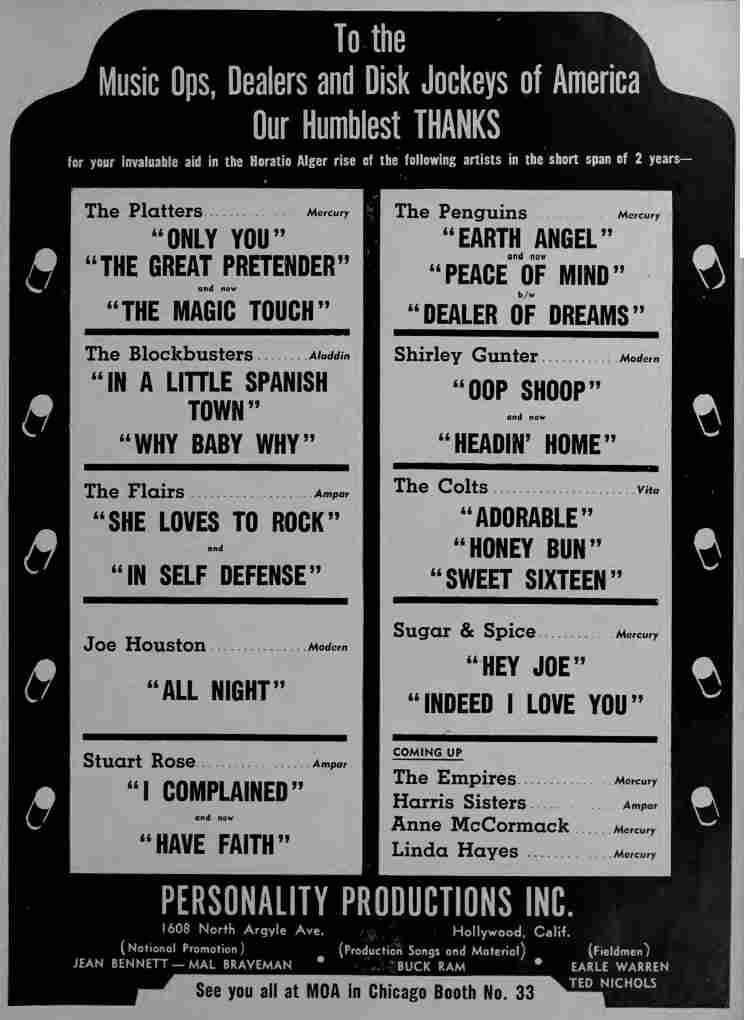 Sometime in July, Shirley was part of an Al Jarvis show at the Los Angeles County Fair Grounds. The Platters, the Six Teens, the Turks, and Joe Houston were also there, but no mention was made of the Flairs. On July 28, the Flairs were at the Municipal Auditorium in Long Beach, California, but no mention was made of Shirley.