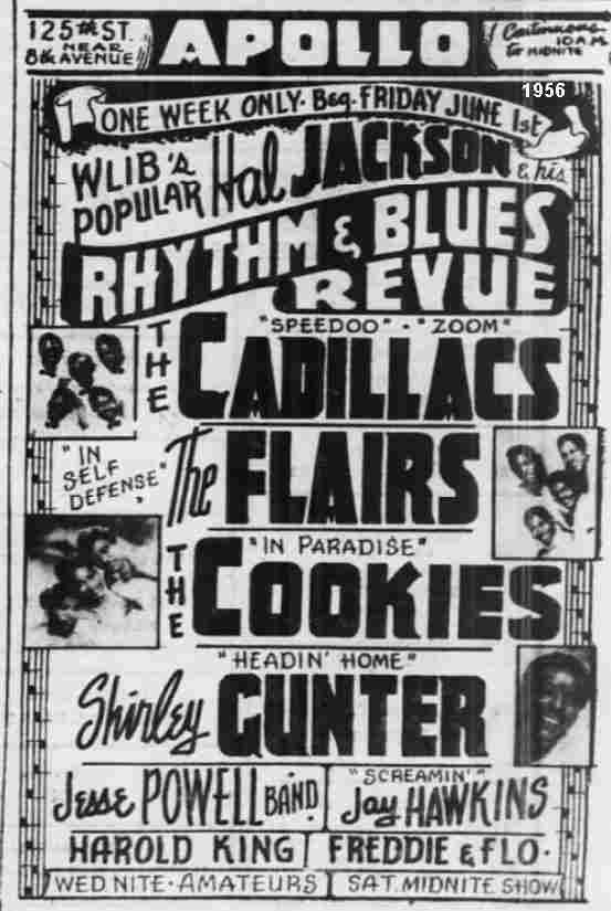 The week beginning June 1, 1956 saw Shirley's only appearance at the Apollo Theater (along with the Flairs). Other acts on the Hal Jackson (WLIB) show were: the Cadillacs, the Cookies, Harold King, Freddie & Flo, Screamin' Jay Hawkins, and the Jesse Powell Orchestra.
