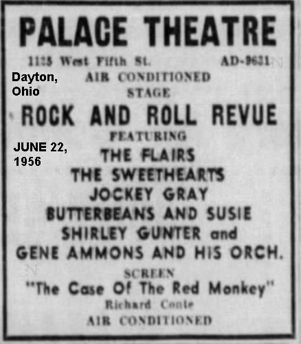 On June 22, Shirley and the Flairs were at the Palace Theater in Dayton, Ohio. Also on the bill were the Sweethearts, Gene Ammons' Orchestra, and Butterbeans & Susie.
