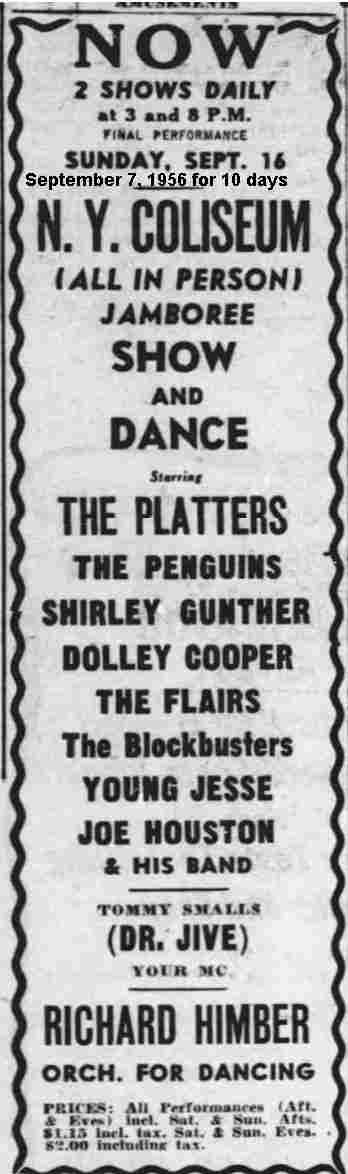 From there, they all went to the Coliseum in Manhattan for a 10-day show, beginning on September 7. It also featured bandleader Dick Himber, the Cues, the Penguins, the Blockbusters, and MC Tommy "Dr. Jive" Smalls. On September 15, they were flown to Buffalo, New York to participate in a Muscular Dystrophy telethon. In spite of what Cash Box said, I can't find any appearances in Montreal or Chicago.