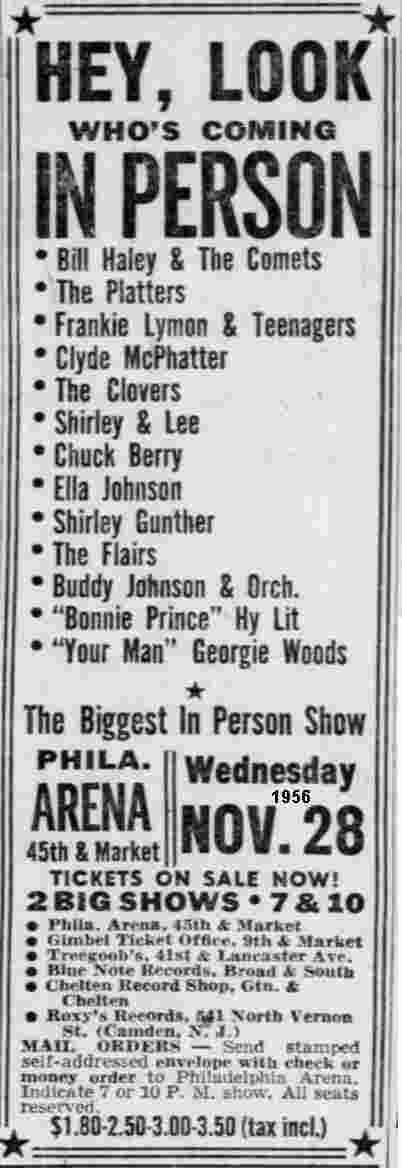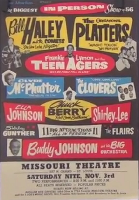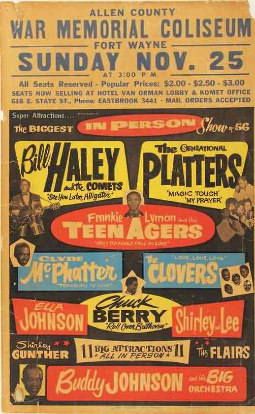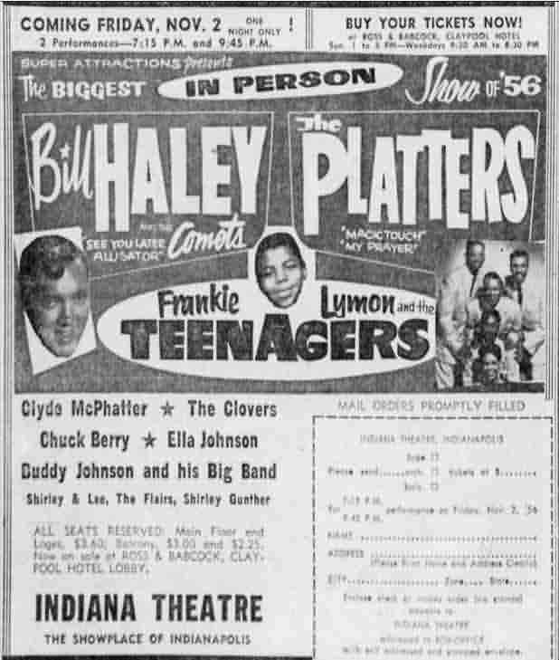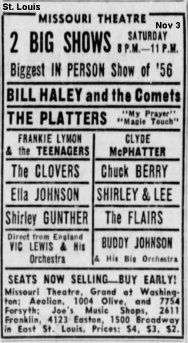 After this, Shirley and the Flairs became part of the Fall Edition of Irving Feld's "Biggest In-Person Rock & Roll Show Of '56". It was booked by the Gale Agency and starred Bill Haley & the Comets and the Platters (the Alan Freed movie, "Rock Around The Clock", which featured both acts, although initially released in March, was still playing all over the country). Also on the tour were the Teenagers, Chuck Berry, Buddy Johnson, Ella Johnson, Shirley & Lee, Clyde McPhatter, and the Clovers. Here's as much of the schedule as I could find. (Note that the schedule book that Buck Ram's office kept gave the dates as 9/28 - 9/30 and 10/11 - 11/25. This explains why I can't find any performances for October 1-10, but not why there were shows for five days past November 25.)