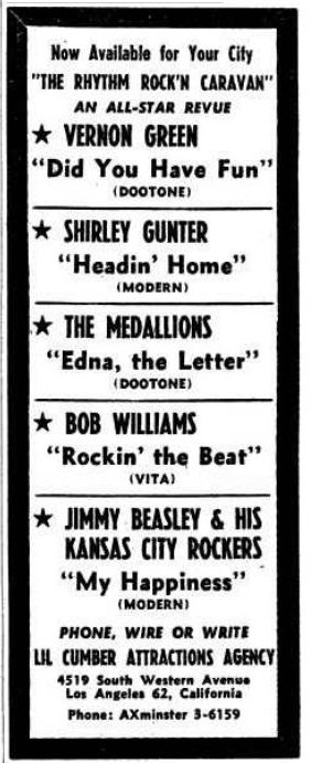 Shirley then broke with Buck Ram. There was an ad in the February 23, 1957 Billboard for the Lil Cumber Attractions Agency (a booking agency). The ad was for "The Rhythm Rock'n Caravan" (which was now available for your city), starring Vernon Green, the Medallions, Bob Williams, Jimmy Beasley, and, of course, Shirley. If the Caravan ever actually appeared anywhere, I can't find a trace of it.