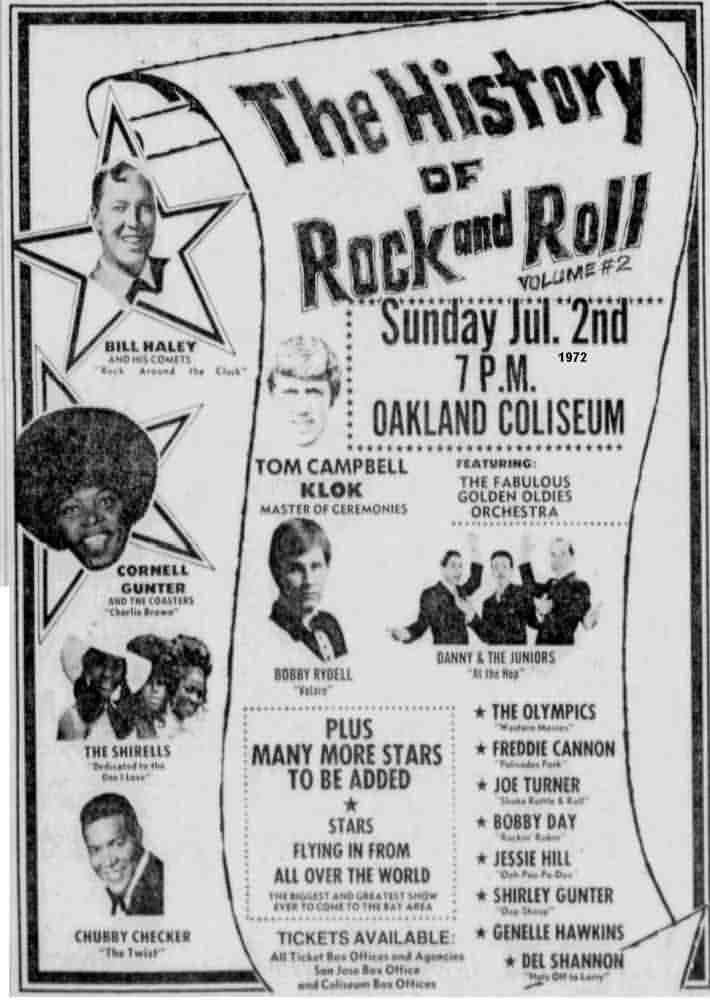 On July 2, 1972, there was a huge show called "The History Of Rock And Roll, Volume 2" at the Oakland Coliseum. It starred Bill Haley, Cornell Gunter's Coasters, the Shirelles, Chubby Checker, the Olympics, Freddie Cannon, Joe Turner, Bobby Day, Jessie Hll, Genelle Hawkins [sic; should be "Jennelle"], Del Shannon, and Shirley Gunter.