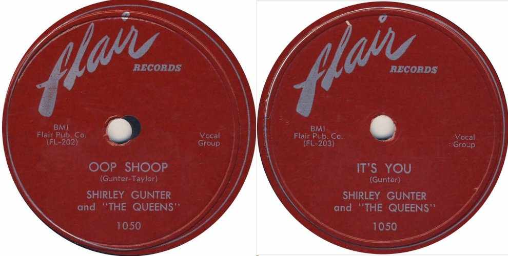 Billboard listed "Oop Shoop" as a Best Buy on September 11 (although it didn't receive a rating): "This tune has kicked off a lot of excitement since its release, and now that the Crewcuts [sic] have stimulated interest further with their powerful pop version of it, Shirley Gunter's original recording is edging close to the national charts. Already on the Los Angeles territorial for two weeks, it is also reported to have strength in St. Louis, Nashville, Detroit, Cleveland, Pittsburgh, and New England. Flip is 'It's You'." Not once was the Queens' name mentioned, only Shirley's.