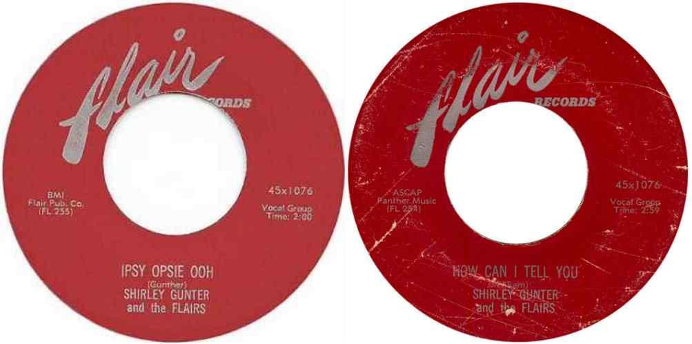 Along the way, Shirley recorded "Ipsy Opsie Ooh", coupled with "How Can I Tell You" (released in August 1955), on which she was backed up by brother Cornell Gunter's Flairs. This was actually the last gasp for the remnants of the original Flairs, who were, at this point, Cornell Gunter, Pete Fox, Obie "Young" Jessie, and Randy Jones. Shirley would end up performing both with and without the Flairs for the next year and a half. There are so many recordings and appearances of each act separately, that I'm not ready to say they were a single entity. They were all managed by Buck Ram, so they were booked into the same venue on many occasions.