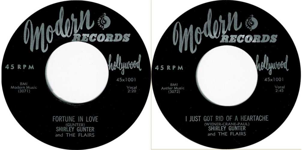 In September 1956, Modern released another record by Shirley Gunter and the Flairs: "Fortune in Love", coupled with "I Just Got Rid of a Heartache". The sides were reviewed in the September 22 Billboard: I Just Got Rid Of A Heartache (82): "The Gunter gal pairs with the Flairs in a very strong effort. It's full of emotional tragedy and the wailing chick sells it all the way. Plenty of plays here." Fortune In Love (79): "This side swings. Interesting material plus solid reading, should mean plenty of jockey attention. A strong coupling." Cash Box agreed, giving both sides "B+" in their September 22 issue.