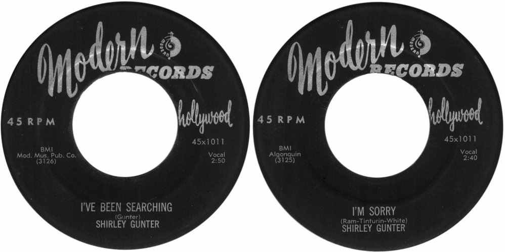 Modern released its last Shirley Gunter record in December (no Flairs in sight): "I've Been Searching", backed with "I'm Sorry". The latter was the same song that the Platters had recorded back in April 1956, but, since their version wasn't released until January 1957, Shirley's rendition can be considered the original.
