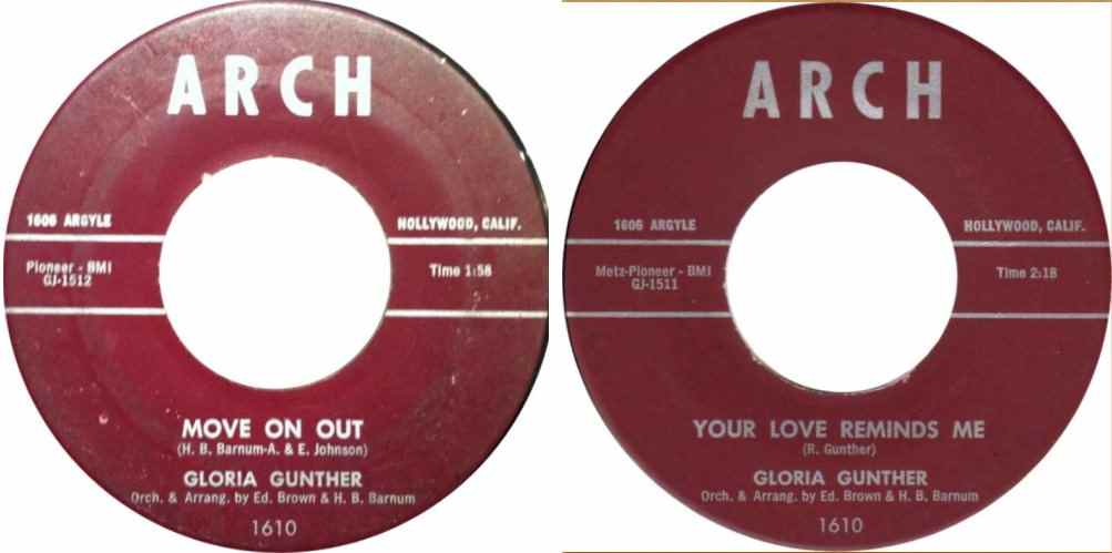 There was an odd record on Hollywood's Arch label in March 1959. Shirley got together with her sister, Gloria, to record a couple of duets: "Move On Out" (an answer to the Coasters' "Yakety Yak") and "Your Love Reminds Me". However, the only name on the label was Gloria's (and that was misspelled "Gunther").