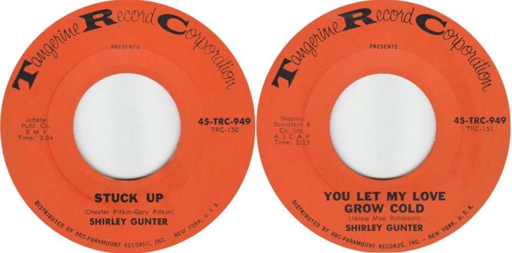 We don't hear of Shirley Gunter again until January 1965, when she released a couple of sides on Ray Charles' Tangerine Records: "Stuck Up", backed with "You Let My Love Grow Cold". There's a girl group on "Stuck Up", resulting in a Supremes-type sound.