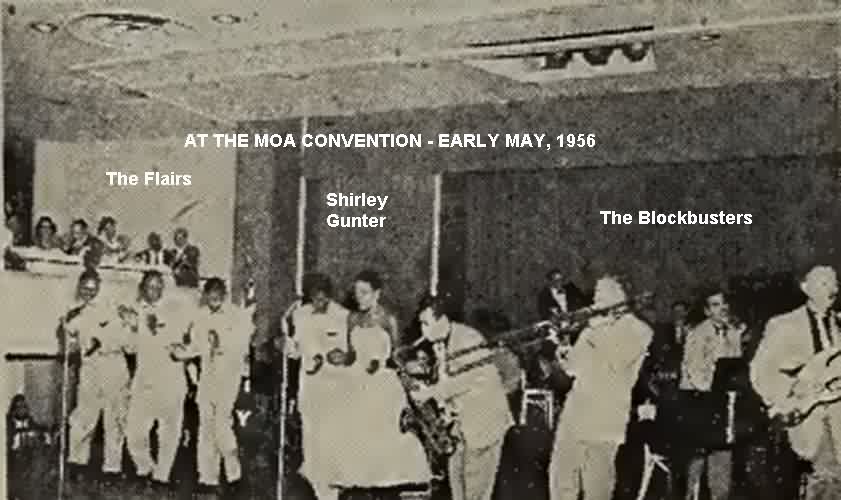 No date was given for this event, mentioned in the April 14, 1956 Cash Box: "Buck Ram hosted a party at the Hotel Martinique [in Manhattan] last week to honor his roster of acts, all of whom are currently working in New York on either the Alan Freed or Tommy Smalls Easter shows. At the party were the Platters, the Penguins, the Colts, Shirley Gunter, the Blockbusters, and Sugar and Spice. Ram, who writes most of the material used by his artists, made a little speech in which he praised 'this true natural talent that is a part of Americana.' Just a short time ago, explained Ram, these artists were car washers, students, mechanics, etc. Each of the above acts contributed to the festivities by performing their specialties." While the others were in town for Apollo and Brooklyn Paramount Easter shows, both Shirley and the Penguins had to come in from their Warner theater engagements that were currently in upstate New York (assuming that those engagements actually took place).