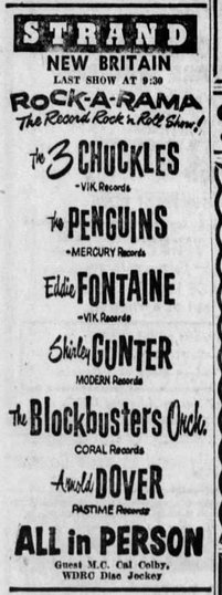 The show - Associated's first rock and roll package - is being booked into theaters on a guarantee and percentage (50-50) basis for four shows a day. The talent line-up includes the Chuckles, the Penguins, Eddie Fontaine, Shirley Gunter, Arnold Dover [a "rock and roll impressionist"], and the Blockbusters. All the acts are managed by Ram and Delaney.