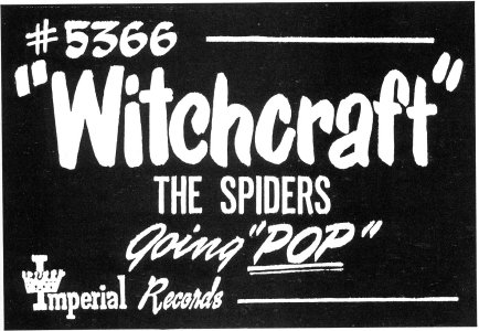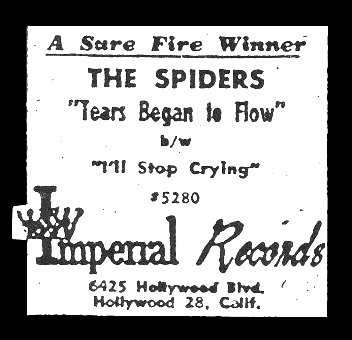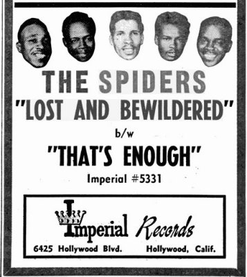 Special thanks to Victor Pearlin Ads are from various editions of Galen Gart's First Pressings series. Discography courtesy of Ferdie Gonzalez. Other sources I used were: Rick Coleman's 1982 "Chuck Carbo and the Spiders" article in Wavelength and his 1992 liner notes to the Bear Family's The Spiders: The Imperial Sessions; and the Spiders section of Todd Baptista's Group Harmony: Echoes Of The Rhythm And Blues Era.