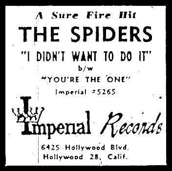 For some reason, Imperial re-released "I Didn't Want To Do It," backed with "You're The One" in August 1959. This probably coincided with Imperial's release of an LP called Hitsville U.S.A., which contained eleven songs by six artists (the Spiders, the Bees, Wee Willie Wayne, the Jewels, Smiley Lewis, and Bobby Mitchell). While most of them had only one song, the Spiders were represented with five: "I Didn't Want To Do It," "I'm Slippin' In," "Witchcraft," "The Real Thing," and "Bells In My Heart."