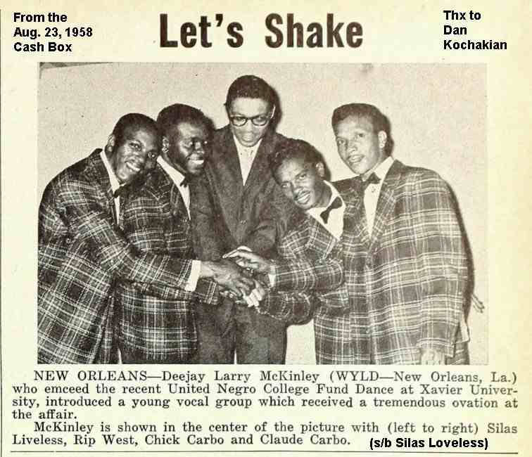 They were "discovered" by Phyllis Boone, who worked for Cosimo Matassa, owner of the New Orleans-based J&M Recording Studios. (Located at Rampart and Dumaine at the time, it had been started in 1944 in a building owned by J&M Amusements.) One day, Phyllis heard Leonard Carbo playing a piano that he was moving as part of his day job. One thing led to another and she asked Leonard to bring the Delta Southernaires down for an audition. This is the way Chuck Carbo remembered it: