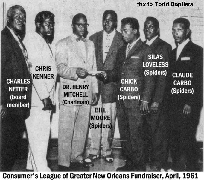 In April 1961 there was still a Spiders group. Todd Baptista says: "Leonard 'Chick' Carbo kept the Spiders going before he also went solo in 1962. In April of 1961, he staged a successful fundraiser concert for the Consumer's League of Greater New Orleans. In this photo, Chick, his Spiders, including another brother, Claude Carbo [Bill Moore, and Silas Loveless], ... present a $2,000 check to board members from the Consumer's League."
