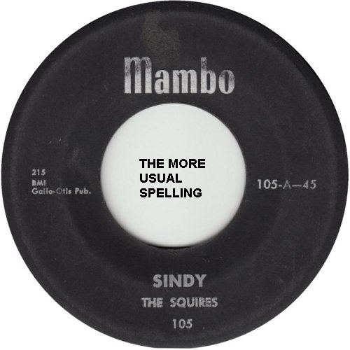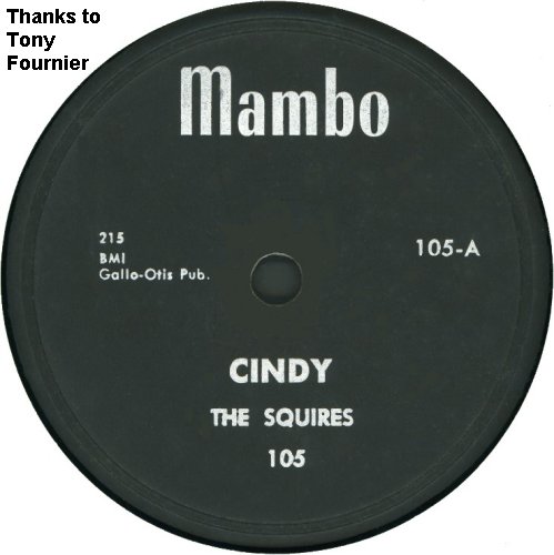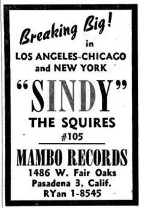 The Squires' first effort under their own name was "Sindy," led by Lee. "I wrote 'Sindy' for a girl down the street that I liked," says Chester. The flip was "Do-Be-Do-Be-Wop-Wop," fronted by Dewey. Released on Mambo in April 1955 (some copies said "Cindy"), "Sindy" was #10 on the Cash Box Los Angeles charts on May 21 and #2 on July 9. This inspired some cover versions: the Tenderfoots on Federal (pretty much the Lamplighters without Thurston Harris) in July, and the Cobras (another group from Pasadena) on Modern in August.