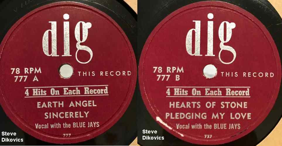 The Squires' first recordings for Mead were on his cheapie Dig This Record label. These fell into the genre of EPs that featured four immensely popular songs covered by immensely unknown artists. They were cast as the "Blue Jays," a name that Chester thinks Mead dreamed up for them, since "Mead was directing the whole ship." They recorded a bunch of hit tunes of the day, most of which had made the national charts between November 1954 and January 1955: "Earth Angel" (led by Chester), "Sincerely" (Chester), "Hearts Of Stone" (Lee), "Pledging My Love" (Don), and "Ling Ting Tong" (Don). They also recorded some that didn't make the current national charts: "Stingy Little Thing" (Don), "Don't Drop It" (Don), "Shoo Doo Be Doo" (all, with Bobby Armstrong on the bridge) and "Every Day I Have The Blues" (Don; a Joe Williams hit from 1952). All the Dig This Record releases were from early 1955.