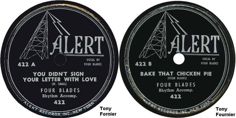 Presumably honing their skills in Brooklyn clubs (although there's not a single word in print of any appearances), they hooked up with Solly Abrams' local Alert Records (at 2413a 65th Street, Brooklyn). This resulted in (probably) a single 1948 session, at which they recorded: "You Didn't Sign Your Letter With Love" (with an Ink Spots sound), "Bake That Chicken Pie", "They Say", and "A Cup Of Java, Please!". These were probably all released at the same time, in late 1948 (Brownie McGhee's "Baseball Boogie" was a spring 1948 Alert release that was 10 numbers earlier).