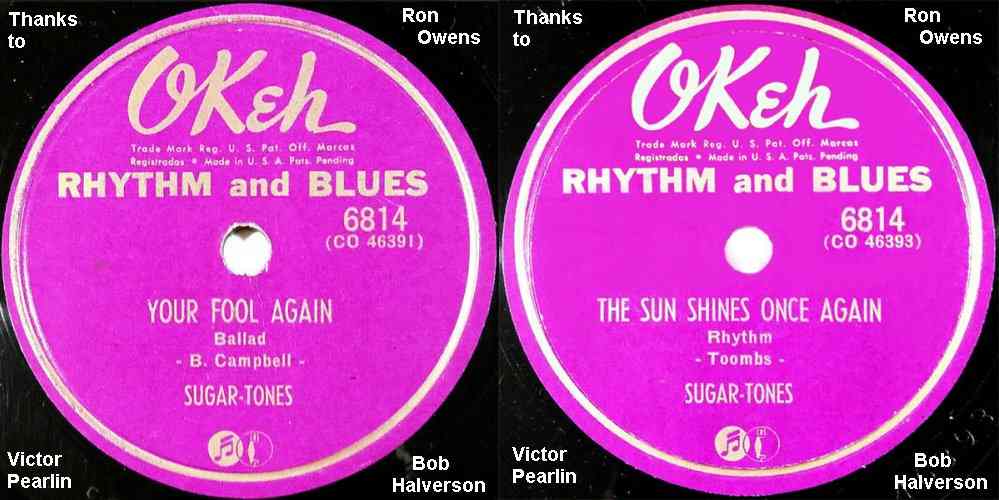 And then, a strange thing happened: the Sugar Tones immediately switched over to Columbia. Since none of their Onyx recordings had yet been released, why this happened is a mystery. Maybe the Sugar Tones had a disagreement with Lipskin; maybe he thought the songs just weren't good enough; maybe they got impatient for him to release something; maybe someone from Columbia Records heard them and made them a better offer. Whatever the reason, the Sugar Tones went off to Columbia. A blurb in the June 23, 1950 Afro-American noted that the Sugar Tones, along with the Do-Re-Me Trio, Arnett Cobb, the Treniers, the Big Three Trio, Red Saunders, the Bill Davis Trio, and Bea Baker would all be placed on Columbia's newly-reactivated Okeh subsidiary (which had been inactive since 1945).