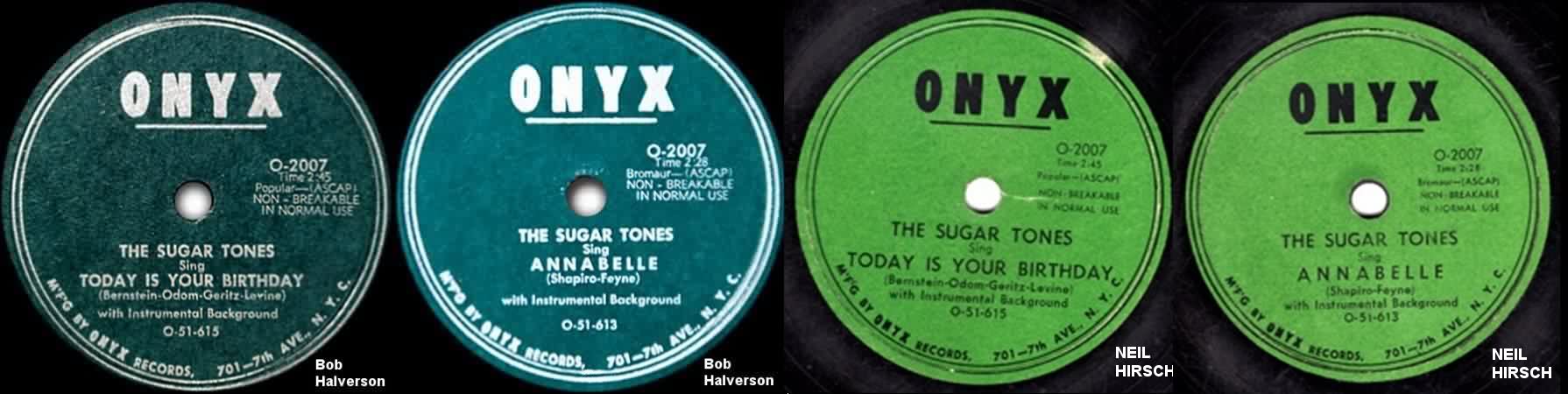 Of course, there's a problem. Billboard's Rhythm & Blues Record Releases column of September 29 lists four of the six Onyx sides: "Annabelle" and "Today Is Your Birthday" (as Onyx 2007) and "They Said It Couldn't Happen (But It Did)" and "The Buzzard And The Hawk" (as Onyx 2008). Every Sugar Tones listing I've ever seen has "They Said It Couldn't Happen (But It Did)" as half of Onyx 2008 (paired with "I Just Want To Dream", as on the Gotham test pressing) and "The Buzzard And The Hawk" paired with "Your Fool Again" as Onyx 2009. OK, I can accept this, so far. These titles would have come from lists sent in by the record companies, and mistakes can be made on lists. However, in the review I mentioned above, "They Said It Couldn't Happen (But It Did)" and "The Buzzard And The Hawk" were also considered to be two sides of Onyx 2008. Since the reviewer had an actual record to listen to, I've got no explanation for this one.
