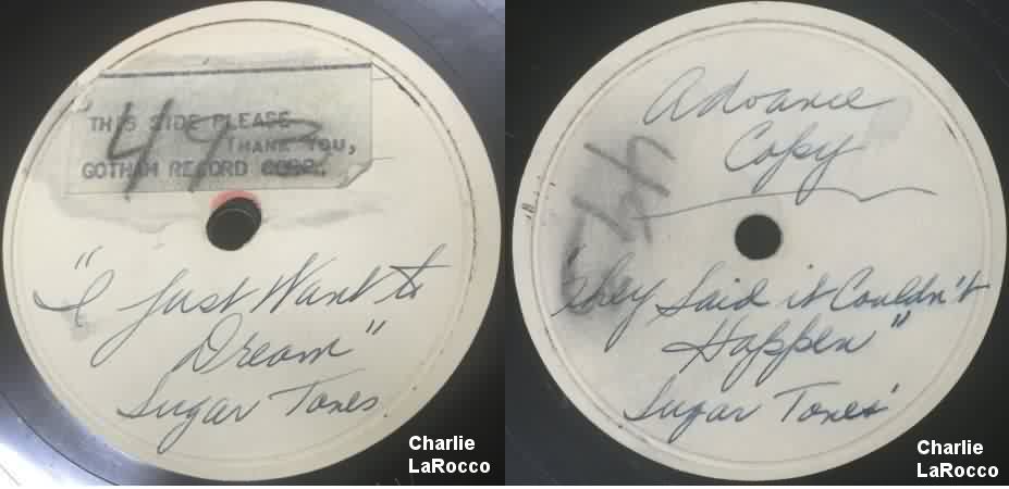 Both Neil Hirsch and Charlie LaRocco have 78 test pressings of "I Just Want To Dream", backed with "They Said It Couldn't Happen"; the plain white labels, marked "Advance Copy", are handwritten. On the "Dream" side, there's a typed sticker saying: "THIS SIDE PLEASE, Thank You, GOTHAM RECORD CORP." The dead wax areas contain the Onyx master numbers (O-51-617 and O-51-616, respectively). The conclusion here is that Onyx Records were pressed (and probably distributed) by Gotham.