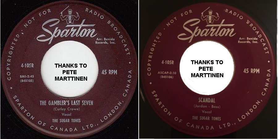 In a September 11 press release, Benida announced a deal to issue their records in Canada on the Sparton label and in the British Isles on Decca. "Scandal" was subsequently released on Sparton in October, coupled with "The Gambler's Last Seven", another of the tunes they'd recorded back in the summer. This pairing was re-released on Sparton sometime in the following year. (So far, I've been unable to find any listings on British Decca.)