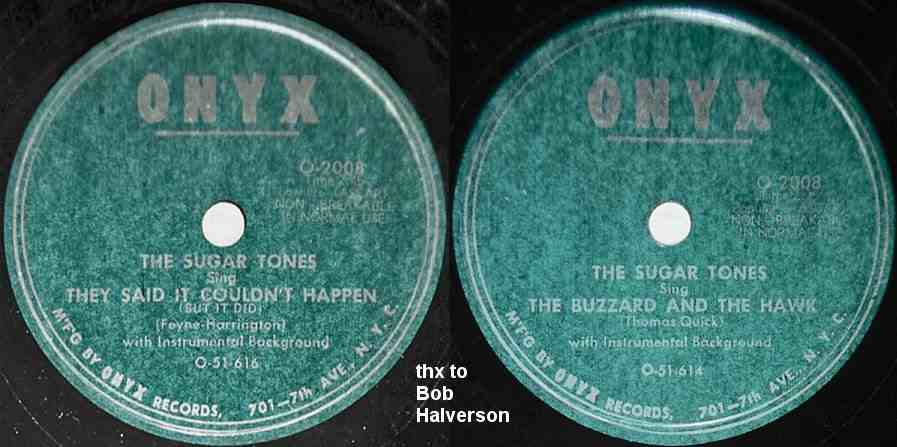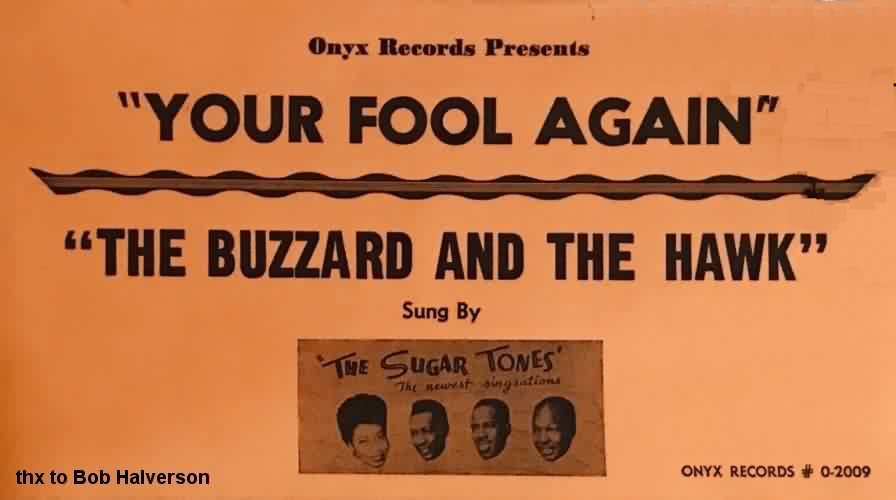 The Sugar Tones first turned to Jerry Lipskin's Onyx Records, at 701 Seventh Avenue in Manhattan. (Lipskin had once been the manager of the DeMarco Sisters.) In the spring of 1951, they recorded six sides, possibly in a single session: "Annabelle", "Today Is Your Birthday", "They Said It Couldn't Happen (But It Did)", "I Just Want To Dream", "Your Fool Again" (a song that had been done by Bonnie Davis & the Piccadilly Pipers the prior year), and "The Buzzard And The Hawk". This last song was copyrighted on September 4, 1951, with words by Robert Bruce and music by Thomas Quick.