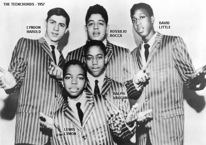 The group that coalesced around Lewis' lead tenor consisted of Rossilio Rocca (second tenor), Lyndon Harold (baritone), and David Little (bass). When it came time for a name, it wasn't a big leap from "Teenagers" to "Teenchords". Rossilio was the oldest (at 19), David was 17, and Lyndon was 15. They were an integrated group: Lewis and David were black, Lyndon was white, and Rossilio was Hispanic. [Want to know a fun fact? No one named "Rossilio Rocca" ever existed in the United States.]