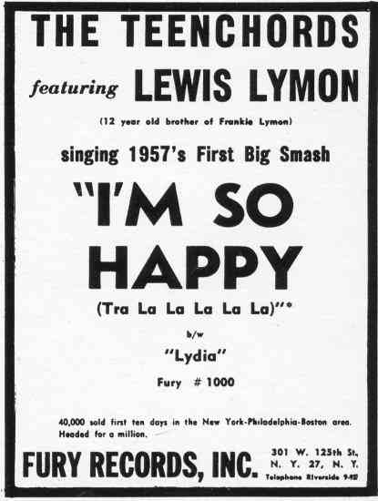 In fact, it took six months for Robinson to release anything by the Teenchords, and then, in December 1956, "I'm So Happy" and "Lydia" became the first record on his brand-new Fury label. (Although the Robinson-Blaine partnership wasn't going well, Whirlin Disc records would be released for several months after this, so I'm still confused by the whole thing.) What were the Teenchords doing for the six months? "We were rehearsing," said Lewis. "We only had the two songs." Rehearsals included dance steps, so, when they were ready to go out and conquer the world, they were really ready.