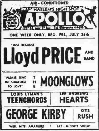 On July 26, it was back to the Apollo. This time, they shared the stage with Lloyd Price, the Moonglows, Lee Andrews and the Hearts, George Kirby, Otis Rush, and Pigmeat Markham.