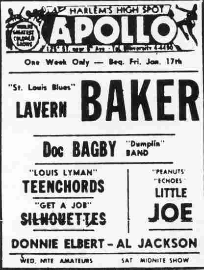 On January 17, 1958, the Teenchords returned to the Apollo. This time they appeared with Lavern Baker, Doc Bagby, Little Joe, Donnie Elbert, the Silhouettes, and Al Jackson.