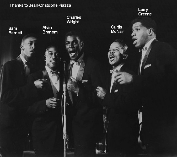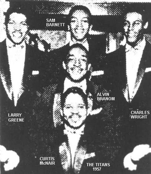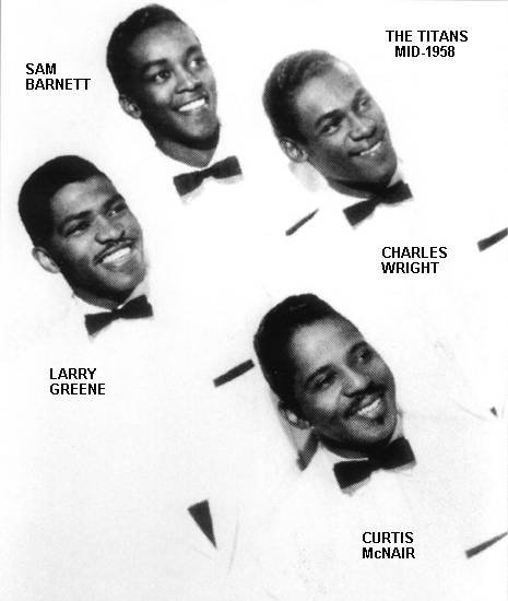 The members of the Titans were: Charles Wright (first tenor, second tenor, and baritone; not the Charles Wright who sang with the Shields), Sam Barnett (first tenor, second tenor and baritone), Curtis McNair (second tenor and baritone; his name was originally spelled "McNear"), Alvin Branom (tenor and baritone), and Larry Greene (baritone and bass). Any of them could sing lead, and they showed their versatility by switching around on their recordings.