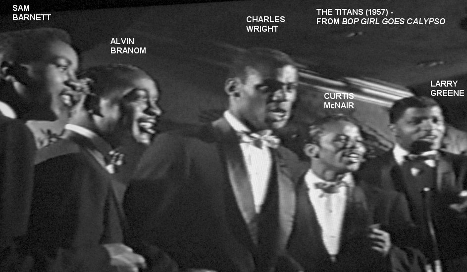 Since Cecil Carter was friendly with Bobby Troup (author of "Daddy," "Route 66," and "The Girl Can't Help It"), the Titans made several appearances at the nightclub that he owned in L.A. Through Troup's efforts, the Titans were tapped to appear in the film "Bop Girl Goes Calypso," one of the R&R exploitation flicks of the day. It starred Judy Tyler (Princess Summerfall Winterspring on the Howdy Doody show), Bobby Troup, and Lucien Littlefield. For music, there were the Goofers, Nino Tempo, the Cubanos, and Lord Flea. The Titans sang "So Hard To Laugh" and "Rhythm And Blues" in the film, which didn't have much to do with calypso at all. They recorded a "G'win Home Calypso" segment for the film, but mysteriously (considering the "premise" of the film) it wasn't used. It should come as no surprise that they got a lot of work from having appeared in the film.