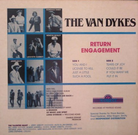 And he did! In 1984, Tandy, at the request of the others (Wenzon Mosley, James Mays, and Lafayette Garrett), journeyed to Fort Worth in order to record an LP. Called Return Engagement, this Marquee album had seven new tunes and a re-recording of "Tears Of Joy" (and was produced by old friend Charles Stewart). However, this was a one-shot deal; the group never made any appearances and soon Tandy returned to Los Angeles, breaking up the Van Dykes for the last time. He recently informed me that Wenzon Mosley passed away in December 2010.